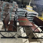 Thiết kế: 2 ghế dài đối diện, bàn gỗ chắc chắn, khung bánh xe trang trí hai bên.