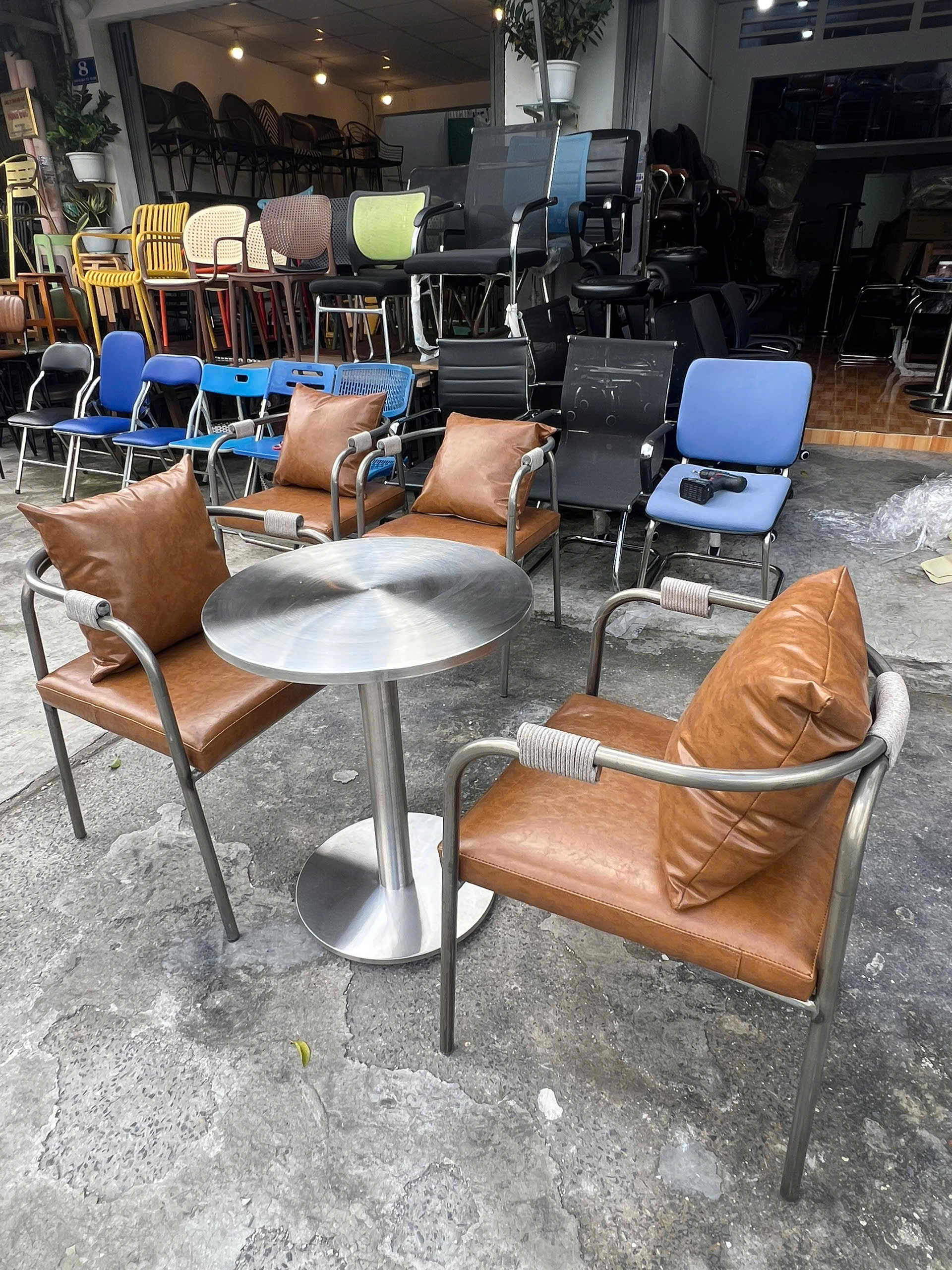 Bộ bàn ghế cafe khung sắt sơn tĩnh điện, nệm da cao cấp, thiết kế hiện đại sang trọng. Phù hợp quán cafe, trà sữa, sân vườn. Giá tận xưởng.