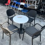 Bộ bàn ghế gồm 1 bàn tròn mặt đá trắng và 4 ghế nhựa đúc cao cấp, là lựa chọn lý tưởng cho không gian ngoài trời như quán cafe, sân vườn, vỉa hè, ban công hoặc khu vực tiếp khách ngoài trời của các văn phòng, showroom.