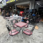 - Mặt bàn và ghế sử dụng gạch men, đá tự nhiên hoặc gốm sứ chịu lực, chịu nhiệt tốt, chống thấm nước.